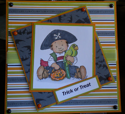 Since it is my off week on the design team, I still always want to play along As you all know I love my challenges and this one stumped me at first, but then I remembered I was wanting to make all the grandson's a card for Halloween to send with their little treats. Since my little one, Reece will be celebrating his first Halloween, I knew this image from Mo's Digital Pencil Too was perfect. Not too scary but just the right touch for an adorable Halloween card. I created this card for the challenge.