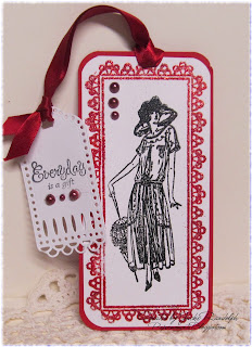 First I inked up this beautiful Lacy Bookmark Frame (410) with embossing ink then sprinkled very generously with Valentine Sparkle embossing powder, (I did rub my embossing buddy over my paper before stamping to ensure the EP only adhered to the areas I stamped). I then stamped Margery (527) with Black EP in the middle of the bookmark frame. I then trimed and adde to red card stock for my backing. Additional bling with pearls and satin ribbon